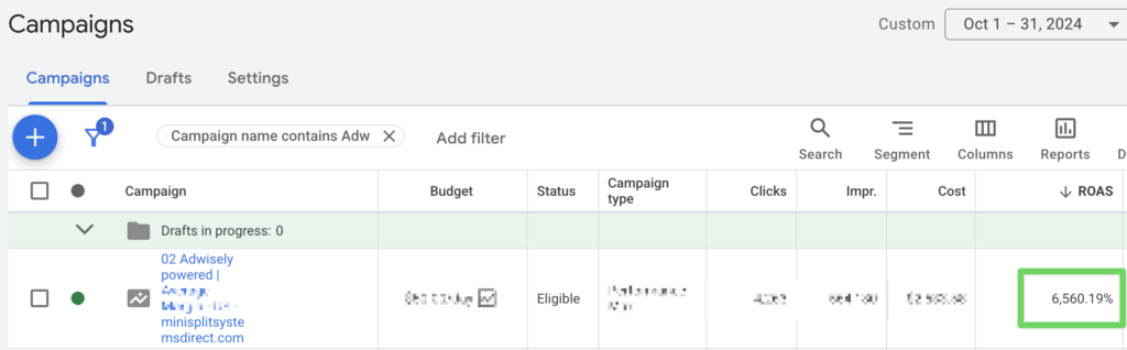 The new campaign began outperforming all the legacy campaigns almost immediately. Within the first two weeks, the results were so strong that we made a strategic choice: we paused all the old campaigns and focused 100% of spend and attention on the Adwisely setup. This consolidation didn’t just simplify management. It also aligned with Google’s own recommendations to aggregate data in fewer, stronger campaigns rather than fragmenting performance across many small ones. With a single, well-structured Adwisely campaign doing the heavy lifting, the Mini-Split Systems Direct team could finally step out of day-to-day account tinkering and concentrate on strategy, merchandising, and customer experience.